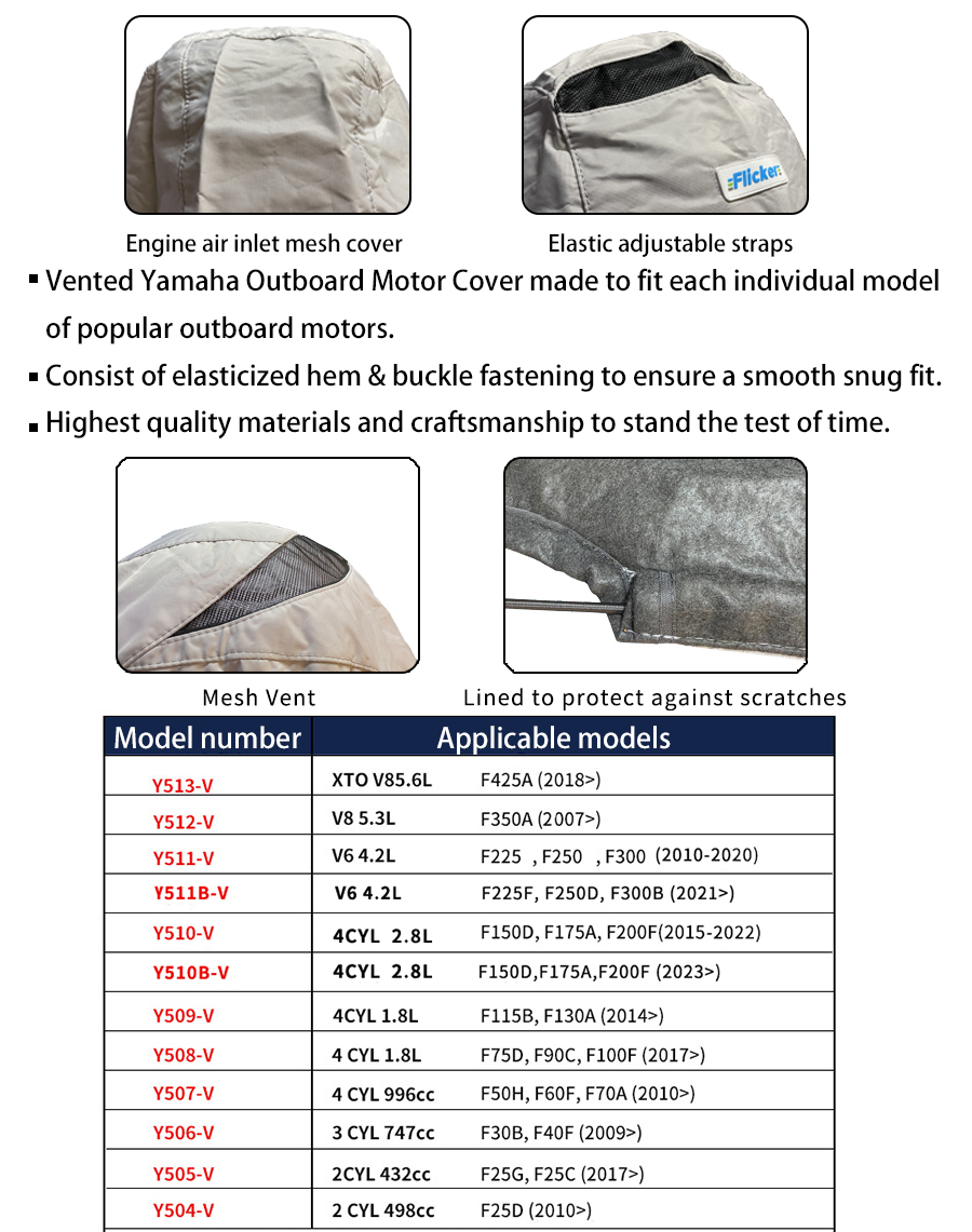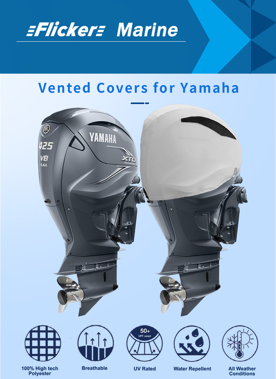 Vented Yamaha Outboard Motor Cover made to fit each individual model of popular Consist of elasticized hem & buckle fastening to ensure a smooth snug fit.Highest quality materials and craftsmanship to stand the test of time.